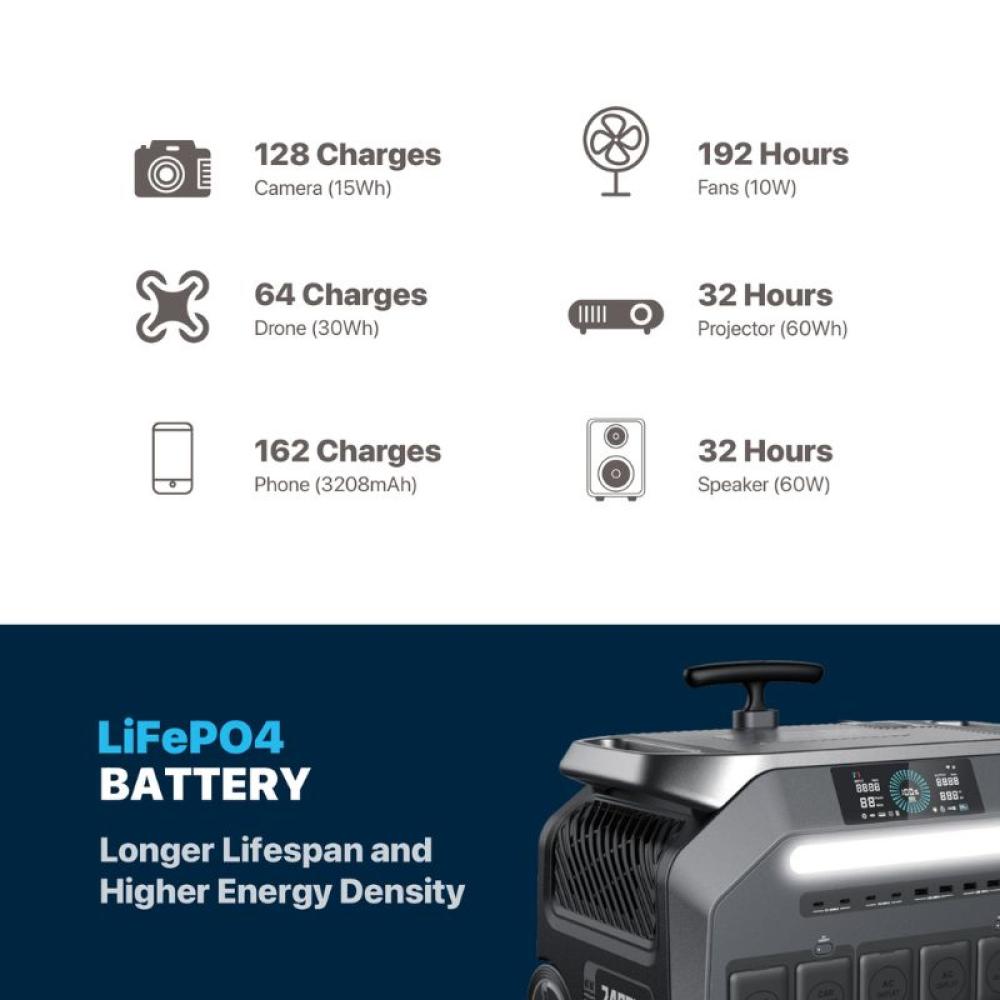 تتضمن الملحقات المرفقة مع الوحدة قابسًا ثلاثي الأطراف بريطانيًا، ويمكنه دعم سيناريوهات شحن متعددة: 128 شحنة كاميرا، أو 64 شحنة طائرة بدون طيار، أو 162 شحنة هاتف. بفضل إضاءة بقوة 3 واط، يُعد هذا المولد المحمول خيارًا مثاليًا للتخييم والأنشطة الخارجية، أو كطاقة احتياطية في حالات الطوارئ.