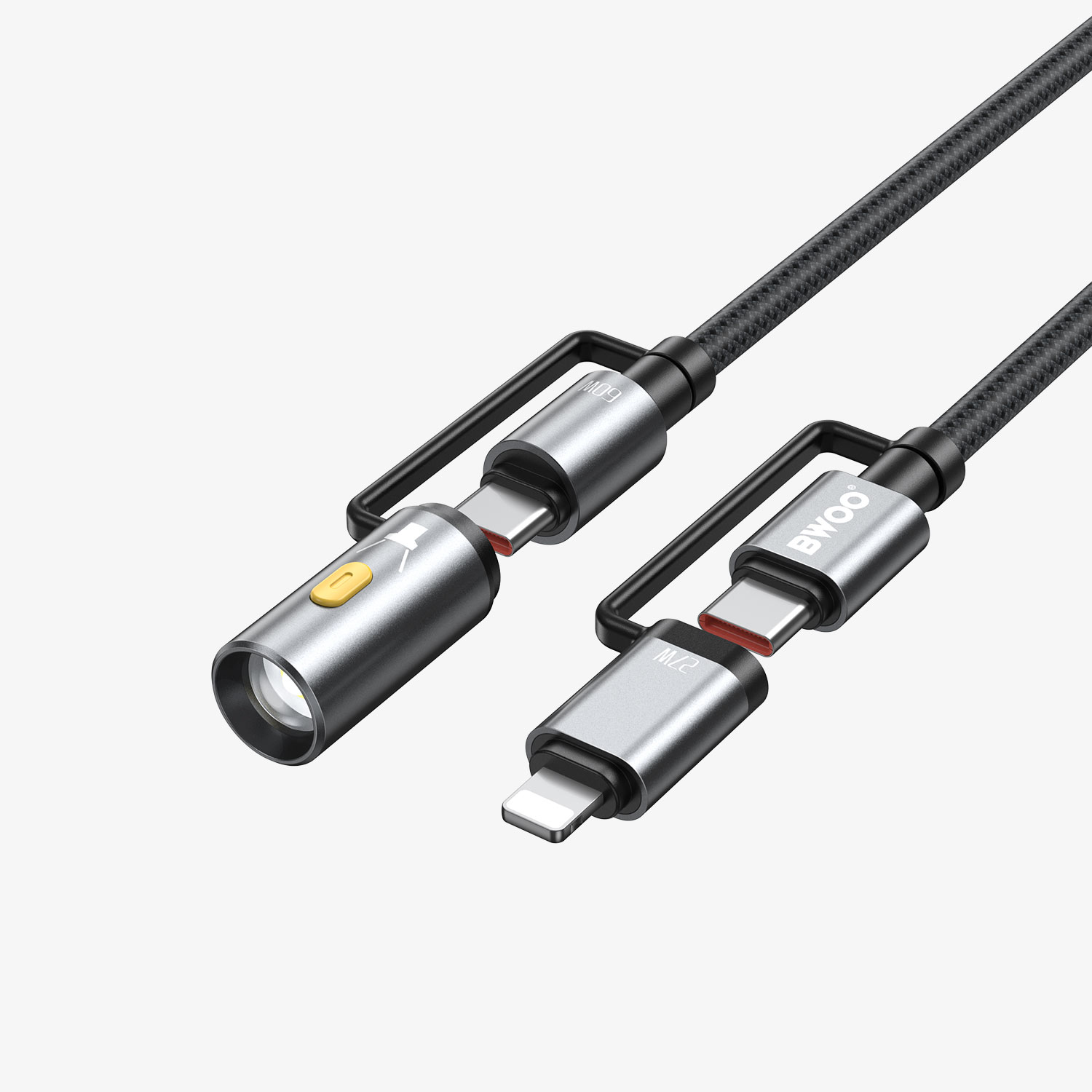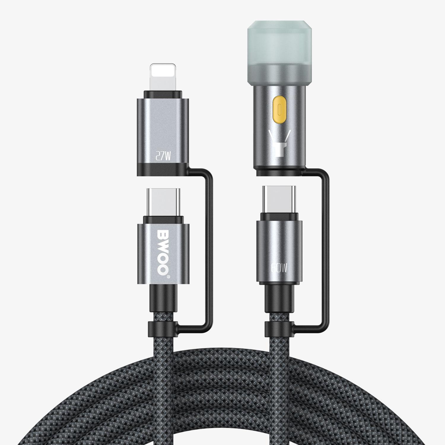 كابل شحن متعدد الوظائف USB-C، 4 في 1، مزود بإضاءة LED، يدعم شحن سريع بقوة 60 واط/27 واط