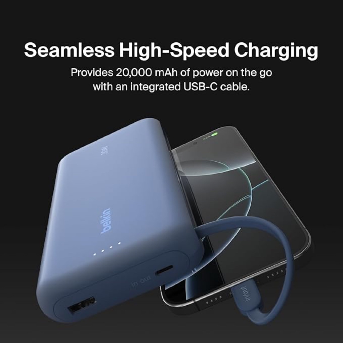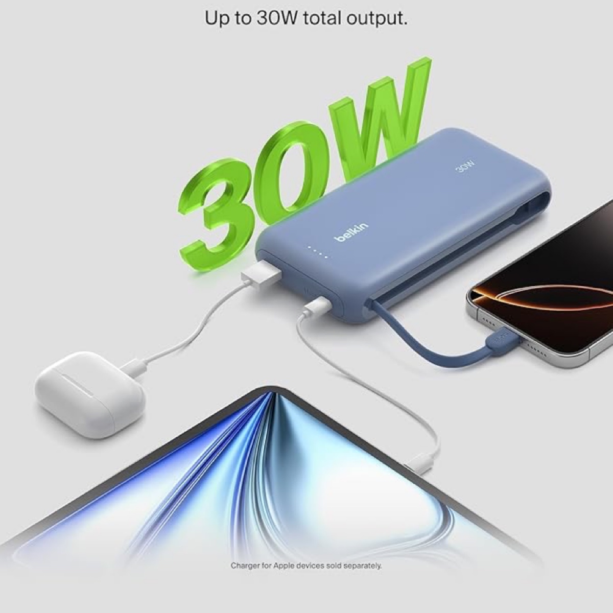 شحن 3 أجهزة في وقت واحد: بفضل كابل USB-C المدمج ومنفذ USB-A ومنفذ USB-C، يمكنك شحن ثلاثة أجهزة في نفس الوقت مع إخراج مشترك 30 واط. اشحن هاتفك وجهازك اللوحي في أي مكان وفي أي وقت.