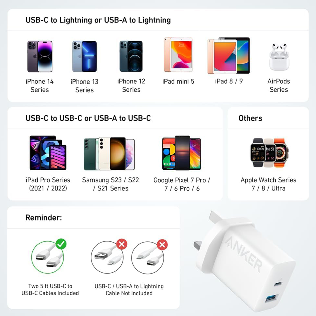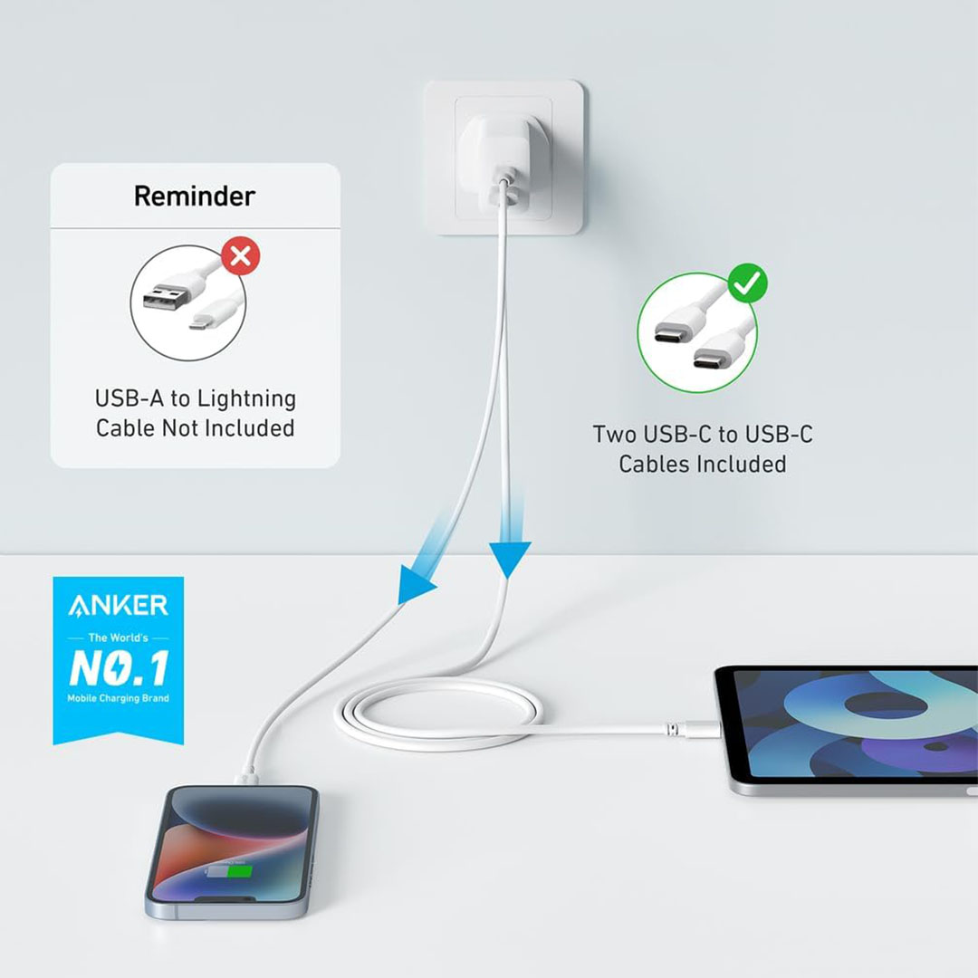 ما تحصل عليه: شاحن أنكر (منفذان، 20 واط)، كابل USB-C إلى USB-C بطول 5 أقدام، دليل ترحيب، ضمان لمدة 18 شهرا، وخدمة عملاء ودية.