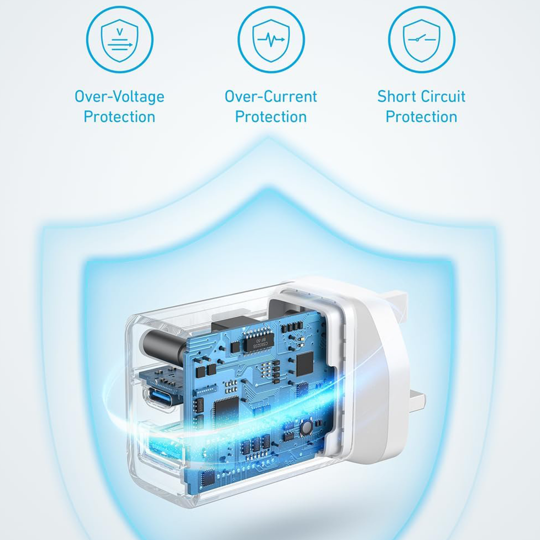 السلامة أولا: كن مرتاحا مع العلم أن نظام السلامة متعدد الحماية من Anker يوفر حماية شاملة لأجهزتك، مما يمنحك راحة البال أثناء الشحن.