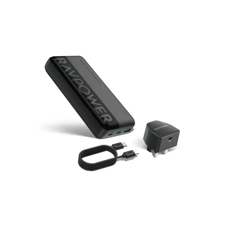 باور بانك بسعة 20000 مللي أمبير مع شحن سريع PD بقدرة 20 واط (3 منافذ)، شاحن جداري USB-C بقدرة 20 واط، وكابل Type-C بطول 1 متر.