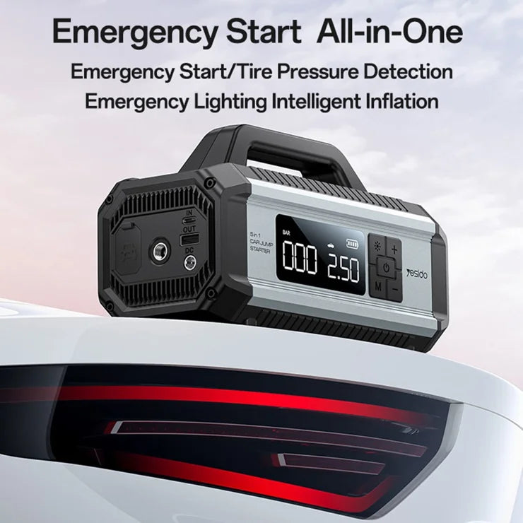 • جهاز 5 في 1: شاحن بطارية – منفاخ إطارات – بنك طاقة – مصباح طوارئ – مصدر طاقة مباشر.