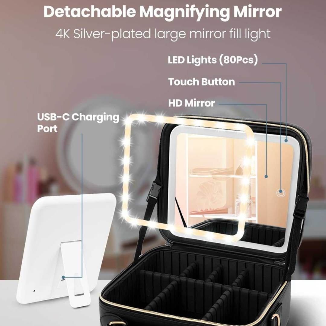 مرآة مكياج احترافية: حقيبة مكياج موكسيدو المحمولة مزودة بمرآة كبيرة بدقة 4K، مزودة بإضاءة LED قابلة للتعديل. اضغطي مطولاً على المفتاح لضبط سطوع الإضاءة من 0% إلى 100%. يمكنكِ ضبط ثلاثة أنواع من الإضاءة بسهولة بلمسة خفيفة، اضغطي مطولاً لضبط سطوع الإضاءة، أو اضغطي لفترة قصيرة لضبط درجة حرارة لون الإضاءة، لتلبية احتياجاتكِ في مختلف المناسبات.