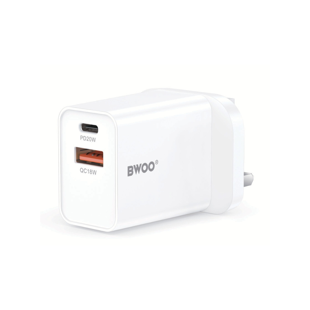 • شاحن جداري بمنفذين: PD 20W + QC 18W لشحن جهازين معاً.