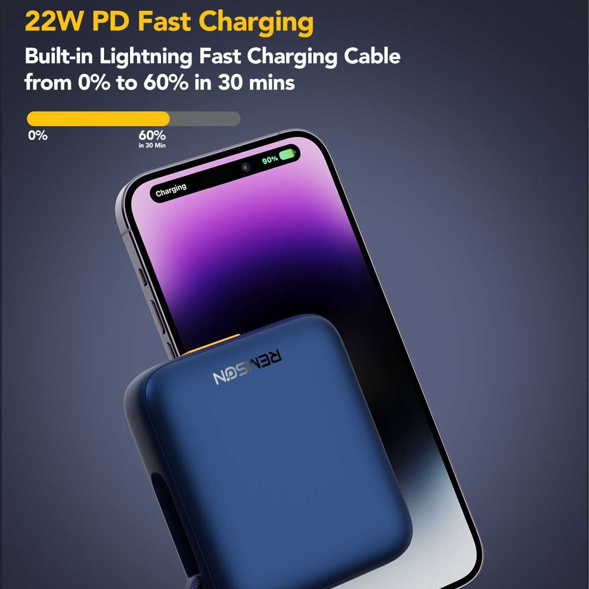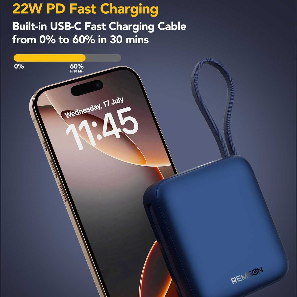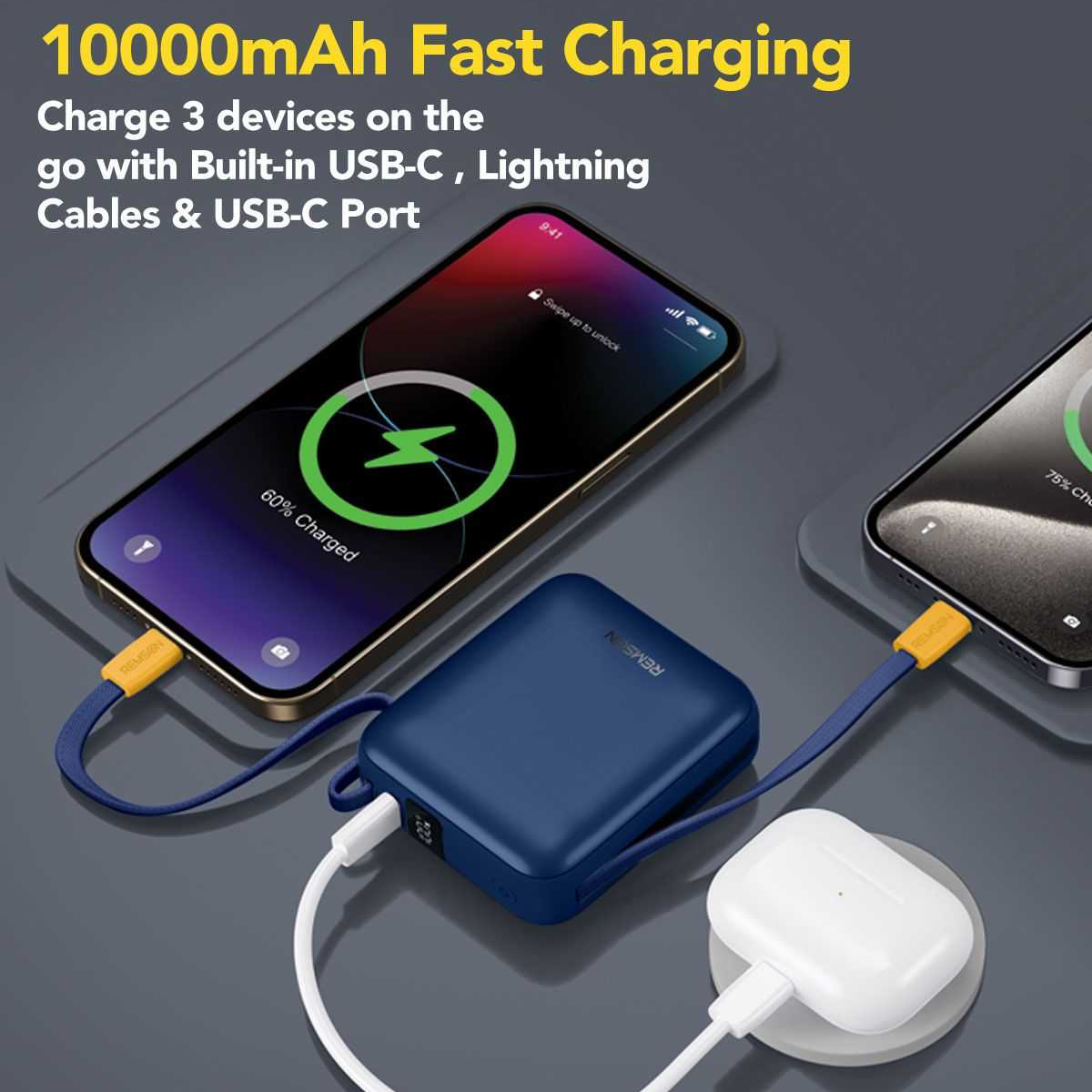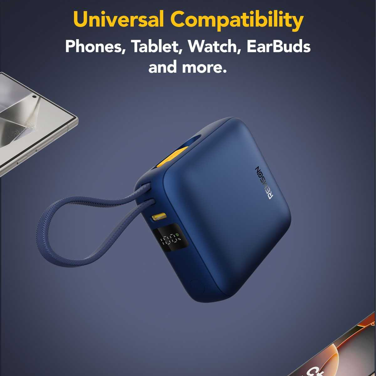 تقنية الشحن المتكاملة: يأتي شاحن ريمسون ريفو تشارج المحمول صغير الحجم بسعة 10,000 مللي أمبير/ساعة مزودًا بمنفذ USB-C مدمج بقوة 22.5 واط وكابل IOS، مما يجعله شاحنًا محمولًا متعدد الاستخدامات يعتمد عليه مستخدمو iPhone وAndroid. تضمن الكابلات المدمجة التوافق مع أجهزة مثل iPad وiPhone وSamsung، حيث يعمل كشاحن محمول صغير يُغني عن حمل كابلات متعددة.