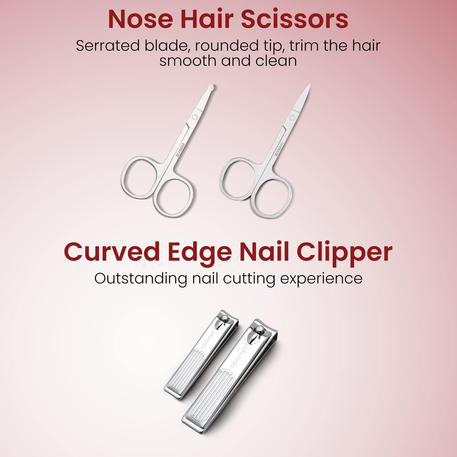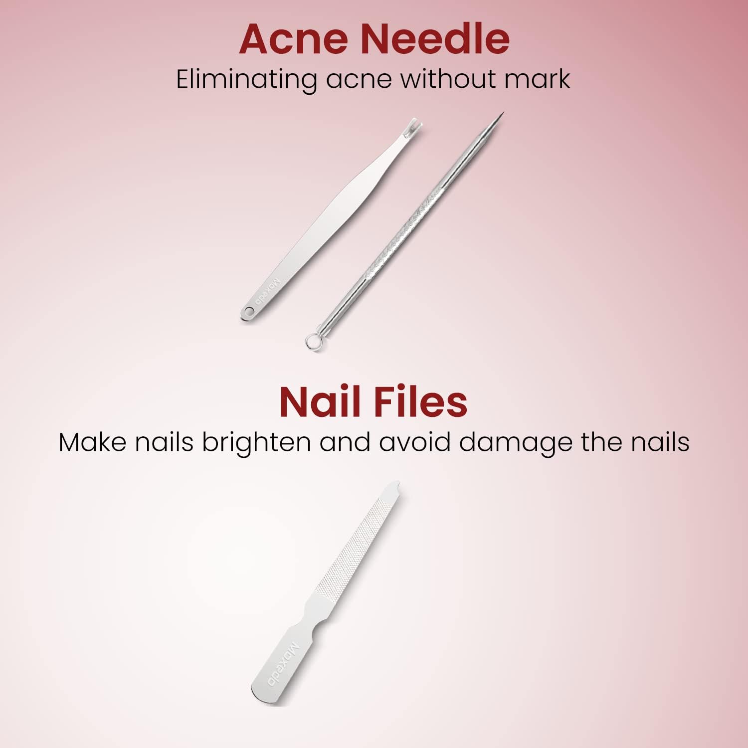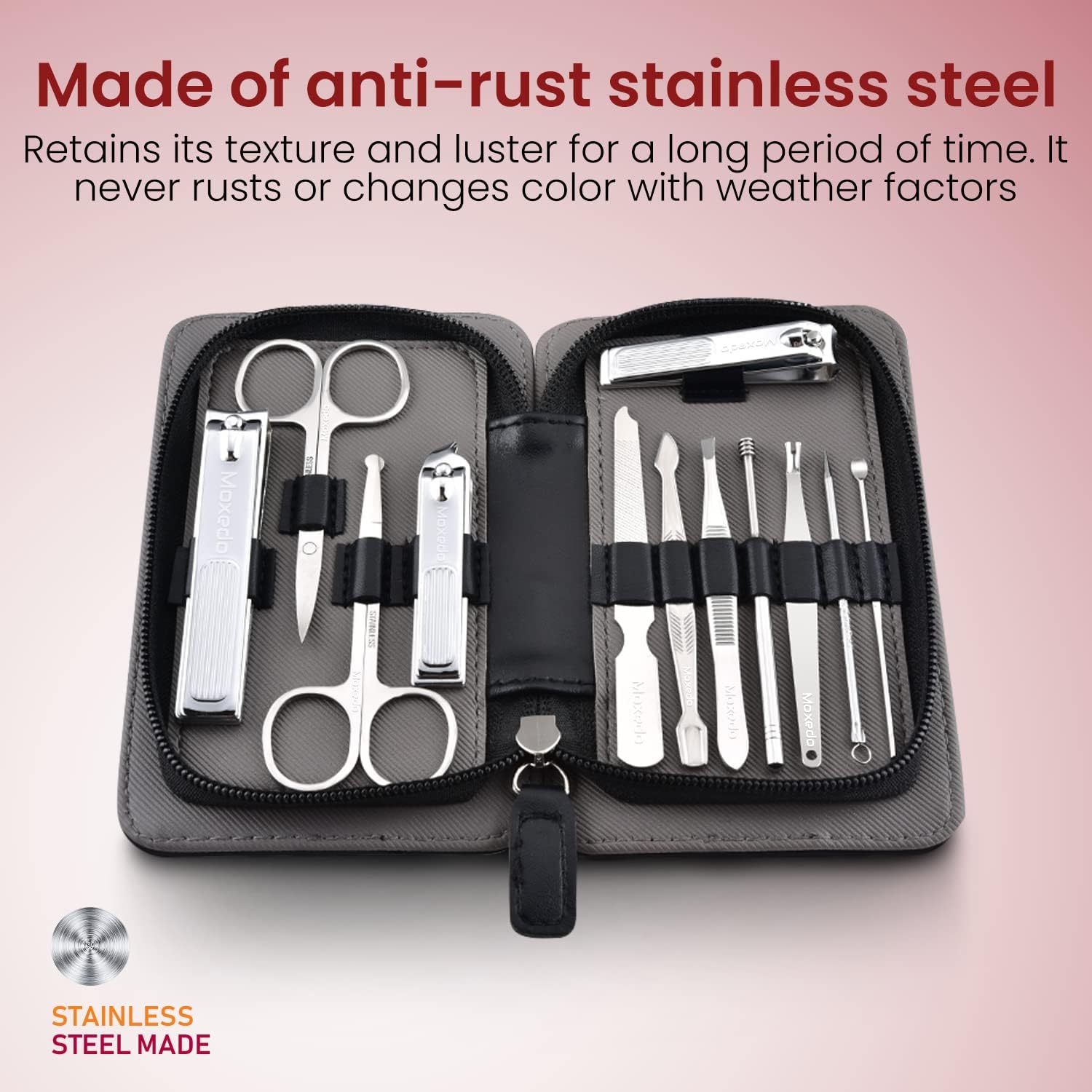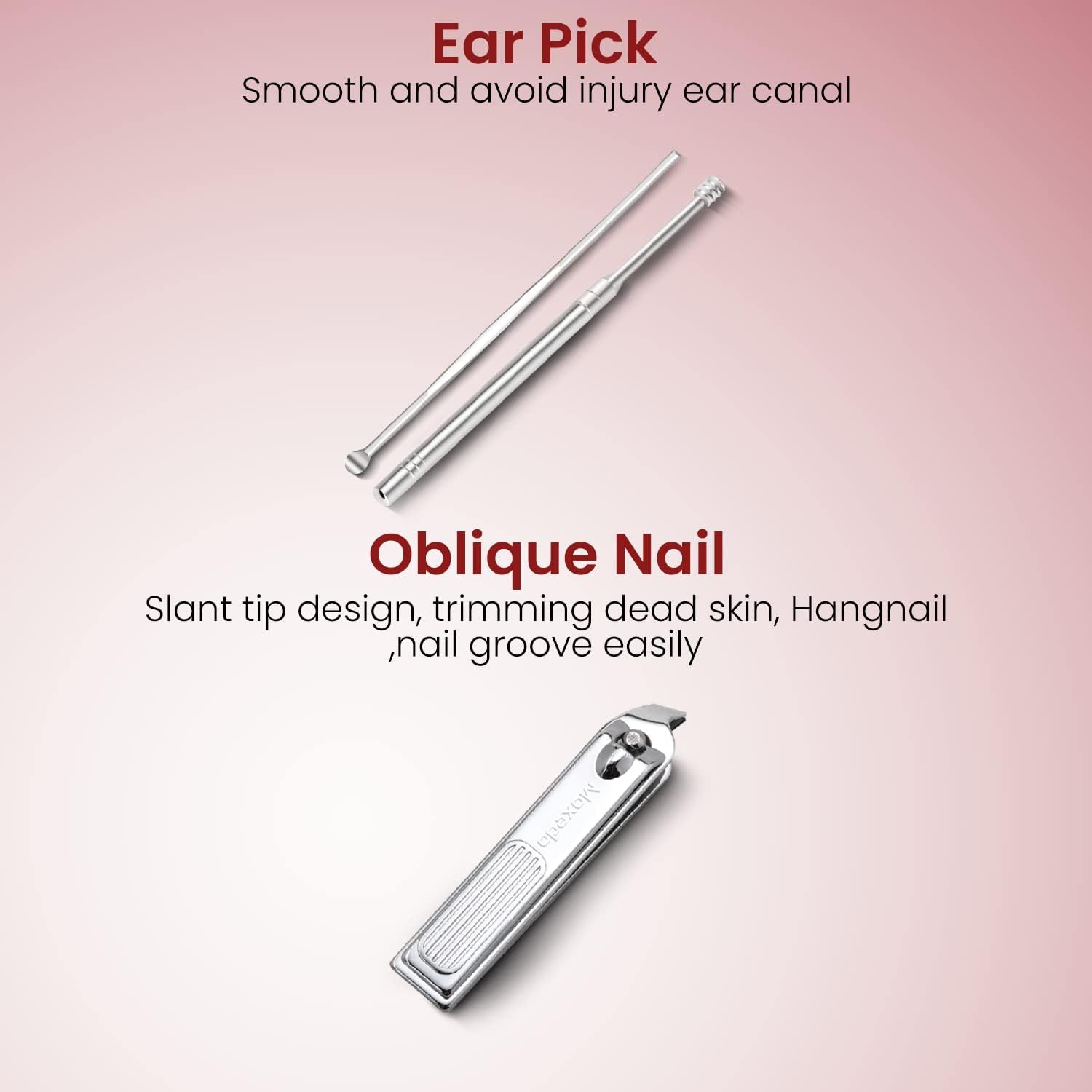 جودة فاخرة: أدوات المانيكير والباديكير المصنوعة من الفولاذ المقاوم للصدأ من موكسيدو مصنوعة من الفولاذ عالي الجودة، وهو قوي ومتين ولن يبهت، ويكون صلبًا للغاية وحادًا. مقلمة مريحة جدًا في يديك ولا تتصارع على الأظافر السميكة. مجموعة من الأدوات اليدوية وأدوات العناية بالقدمين وأدوات تنظيف الوجه.