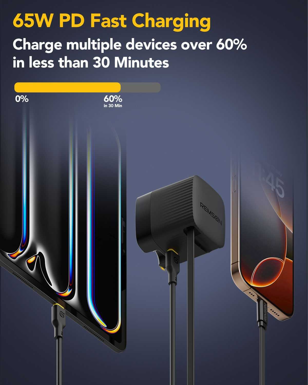 • شحن سريع 65 واط لجهازين: شغّل هاتفك الذكي أو جهازك اللوحي في آنٍ واحد باستخدام مقبس الشحن الحائطي القابل للسحب هذا، والذي يتميز بكابل قابل للسحب ومنفذ USB-C، مما يوفر شحنًا سريعًا يصل إلى 65 واط، ويشحن هاتفك بالكامل في أقل من 40 دقيقة، ويضمن شحن أجهزتك بكفاءة وثبات.