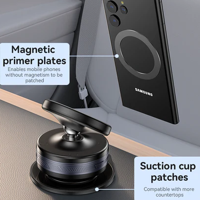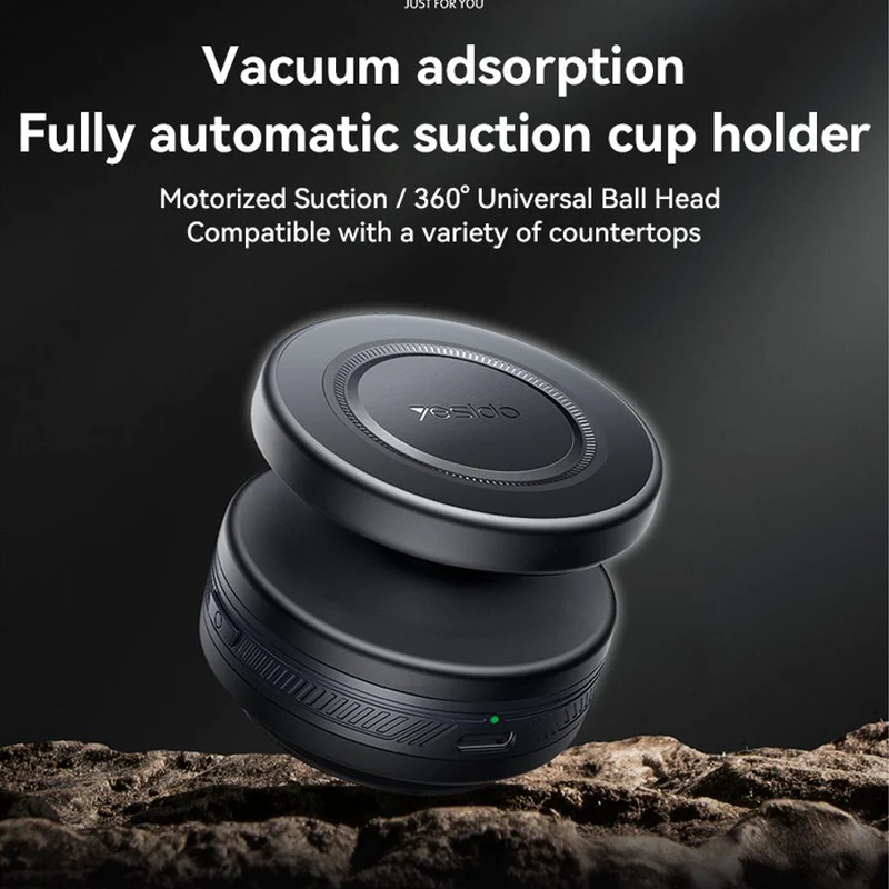 تقنية الشفط الكهربائي الفائقة: مزود بمحرك شفط آلي مدمج يخلق فراغًا هوائيًا لتثبيت الحامل بقوة فائقة على مختلف الأسطح مثل زجاج السيارة، البلاستيك، الخشب، المعدن، وحتى الحجر.