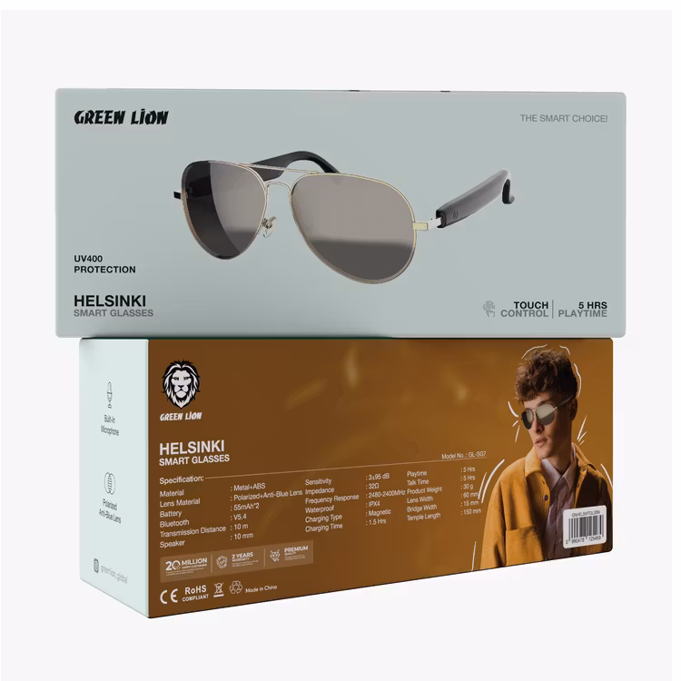 تجمع نظارات Green Lion Helsinki الذكية بين الراحة والأداء الوظيفي بشكل مثالي من خلال الجمع بين التكنولوجيا الحديثة والتصميم العصري. تحتوي هذه النظارات الذكية على تقنية Bluetooth V5.4. إنها تضمن اتصالاً موثوقًا بطول 10 أمتار. لذلك، يمكنك إجراء مكالمات بدون استخدام اليدين وبث الموسيقى دون صعوبة. تعمل العدسات المستقطبة المضادة للزرقاء على تحسين الوضوح البصري عن طريق تقليل إجهاد العين والتكيف مع ظروف الإضاءة المختلفة. يمكن للمستخدمين الاستمتاع بالصوت الغني بدون سماعات الأذن. تنتج مكبرات الصوت مقاس 10 ملم صوتًا واضحًا بحساسية تبلغ 95 ± 3 ديسيبل. البطاريات المزدوجة بقدرة 55 مللي أمبير في الساعة مخصصة للاستخدام طوال اليوم. أنها توفر ما يصل إلى 5 ساعات من وقت المكالمة وتشغيل الموسيقى. تضيف طريقة الشحن المغناطيسي السريعة لمدة 1.5 ساعة البساطة. تصنيف IPX4 الخاص بها يعني أنها تقاوم البقع والأمطار الخفيفة. لذا، فهي مثالية للارتداء اليومي. تعمل الميزات الذكية التي تعمل على تحسين سهولة الاستخدام على تمكين التفاعلات دون عناء. وهي تشمل تنشيط المساعد الصوتي والتحكم عن بعد في الكاميرا وأدوات التحكم البسيطة باللمس. نظارات Green Lion Helsinki الذكية أنيقة وعالية التقنية وأنيقة. إنها تحمي عينيك أثناء الاتصال بالإنترنت. ارتديها للعمل أو العطلات أو اللعب.