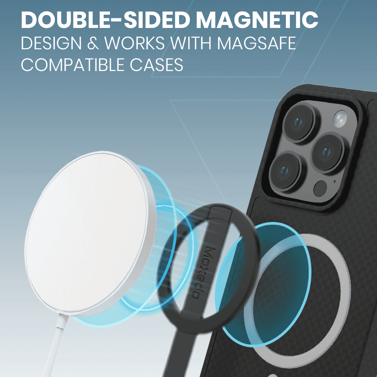 · قابل للإزالة بسهولة: للتثبيت، قم بمحاذاة قاعدة قبضة الهاتف مع الحلقة المغناطيسية على هاتفك أو العلبة. للإزالة، ادفع برفق جانب أو حافة القاعدة المغناطيسية - تجنب سحب المقبض مباشرة.